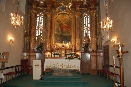 Beim Rundgang im Inneren der Kirche ist der spätbarocke Hochaltar ein Blickfang. Über dem Gemälde der Kirchenpatronin befindet sich eine Darstellung der Heiligen Dreifaltigkeit. Eine Marmorplatte auf der rechten Seite neben dem Hochaltar erinnert an den 1649 verstorbenen Gotthard von Tattenbach. Als Weißenburgbesitzer und Patron der Kirche wurde er hier mit seiner Frau Sara Sophie in einer Gruft beigesetzt. Die sechseckige Kanzel aus der Renaissance ist innerhalb der Diözese St.Pölten eine Rarität. Die Statuen auf dem Hochaltar stellen folgende Heilige dar: hl. Josef, hl. Paulus, hl. Petrus, hl. Johannes der Täufer.