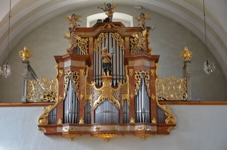 Auf der Orgelempore steht David mit der Harfe und Engel mit Pauken, Trompeten und Fanfaren. Die Orgel wurde zuletzt 1986 renoviert.