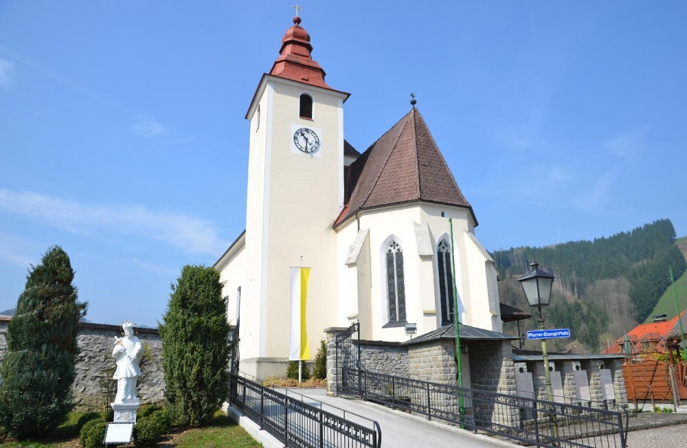 Südseitig der Kirche liegt der Friedhof, von einer Mauer umrandet, bei dessen Haupteingang rechtsseitig das Kriegerdenkmal und linksseitig die Statue der hl. Johannes Nepumuk, dem Patron der Priester, Müller und Flößer, dem Schutzheiligen der Brücken, zu besichtigen ist.
