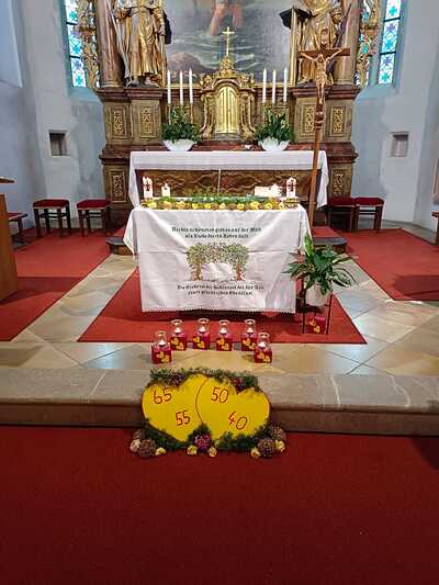 Für die Gestaltung der heiligen Messe sowie der anschließenden Agape für die Jubelpaare im Pfarrheim Miteinander sorgten Ulrike Schweiger, Karin Steinböck sowie Jutta Breitenecker. Beatrice Löffler gestaltete die Kerzen, die zusammen mit einer Rose an die Jubelpaare verschenkt wurden.