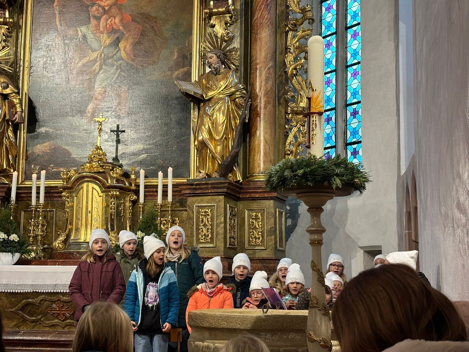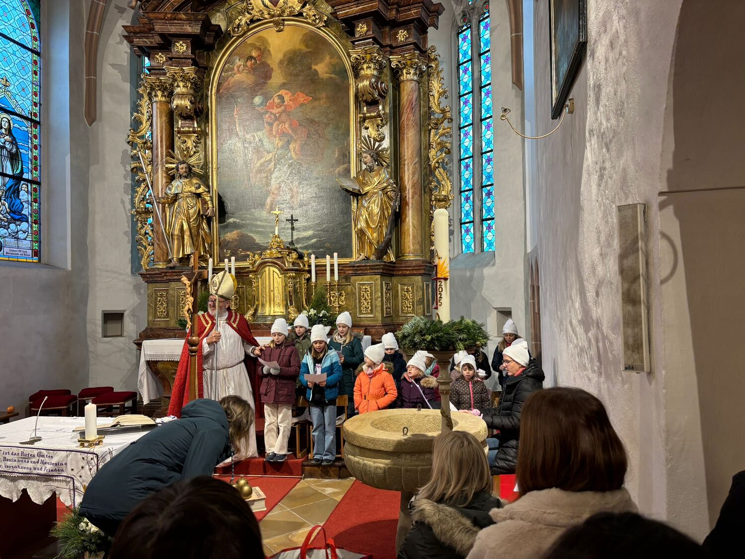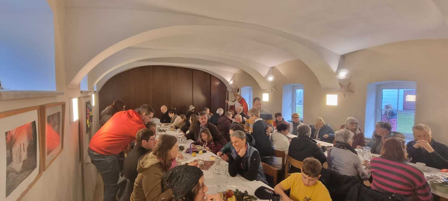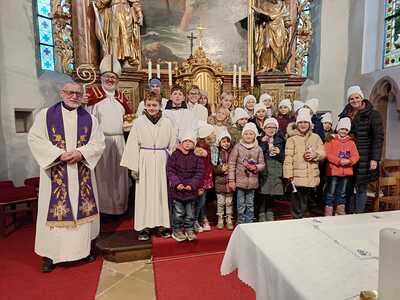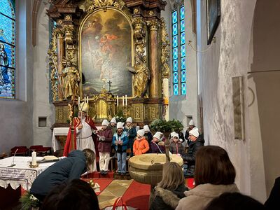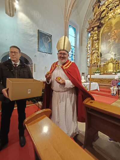 Die heilige Messe wurde durch den Kinderchor und die Ministranten gestaltet. Als Belohnung gab es Äpfel und Schokonikoläuse für die kleinen Messbesucher. Mit der neuen Chorleiterin Elisabeth Herbst-Kropatschek haben die Kinder die Messe musikalisch gestaltet. Anschließend wurden die hungrigen Messbesucher mit Cafe, Kuchen, Punsch und Brötchen beim Pfarrcafe durch die Gruppe Schulgasse / Hub versorgt.