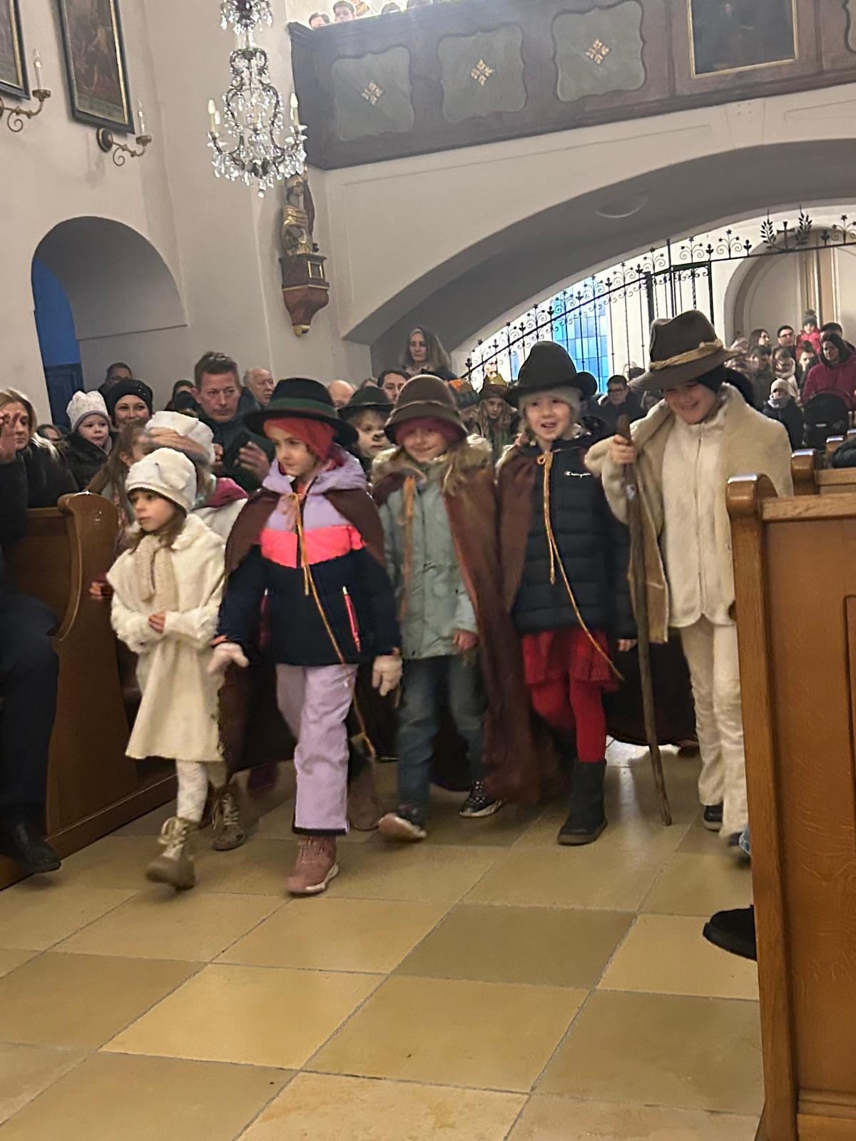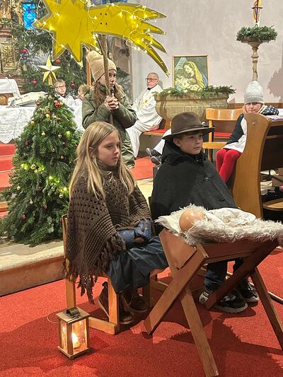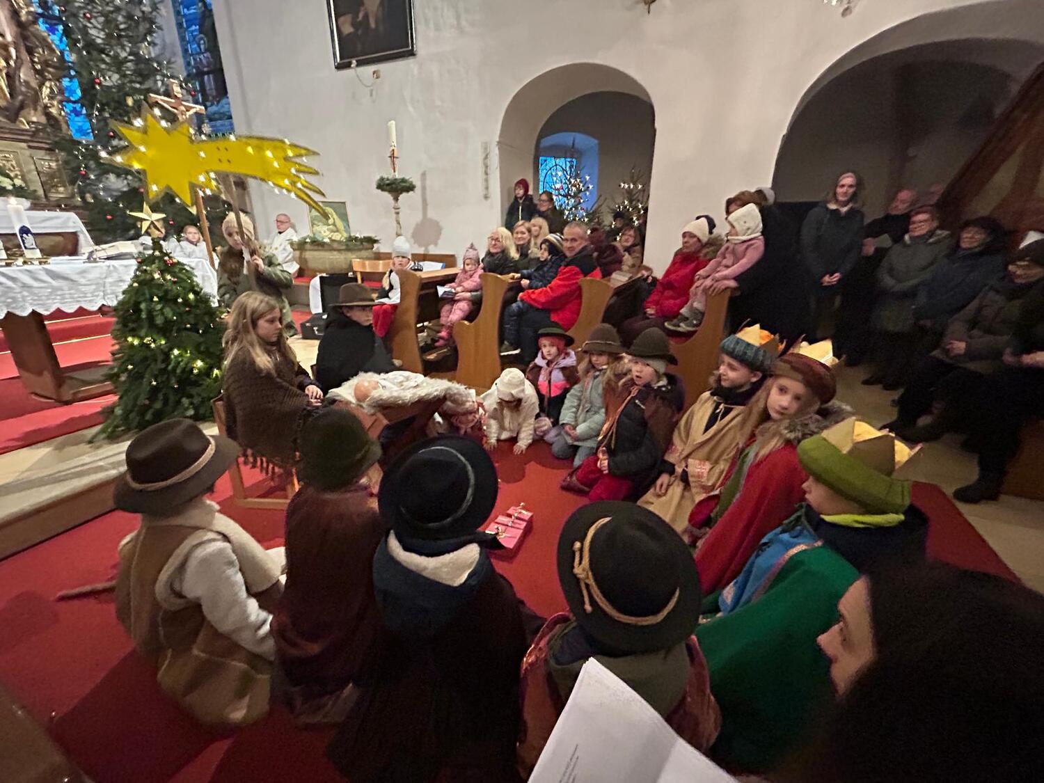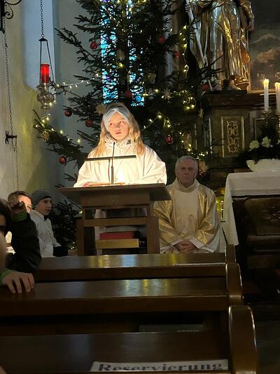 Pfarrer Mag. Jackowski zelebrierte gemeinsam mit Mag. Tracz die Kindermette. Weihrauch durfte an diesen Tag auch nicht fehlen und so durften die Ministranten das erste Mal das Weihrauchfässchen bedienen. Die vielen Kinderaugen leuchteten beim Krippenspiel. Musikalisch umrahmt wurde die Messe durch Elisabeth Herbst-Kropatschek (Klavier), Jutta Breitenecker und andere.