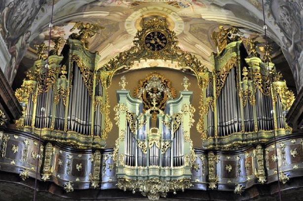 Das Hauptwerk ist in zwei seitlich des großen Fassadenfensters stehende fünfteilige Prospekte aufgeteilt, die durch einen geschwungenen Rocaillebogen mit Uhr verbunden sind. Vergoldete Schleierbretter und Engel bilden den Schmuck. Das ebenfalls fünfteilige Brustpositiv ist in die Emporenbrüstung eingefügt.