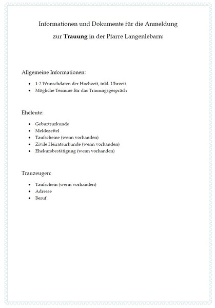 Wenn Sie in der Pfarrkirche Langenrohr heiraten möchten, melden Sie sich bitte telefonisch oder per Email für eine Terminvereinbarung in der Pfarrkanzlei. Zu diesem Termin nehmen Sie bitte folgende Dokumente mit: