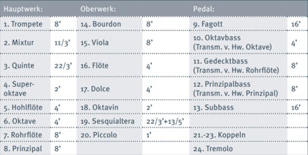 Das Instrument, eine mechanische Schleifladenorgel mit mechanischer Registertraktur, weißt folgende Dispositionen auf: