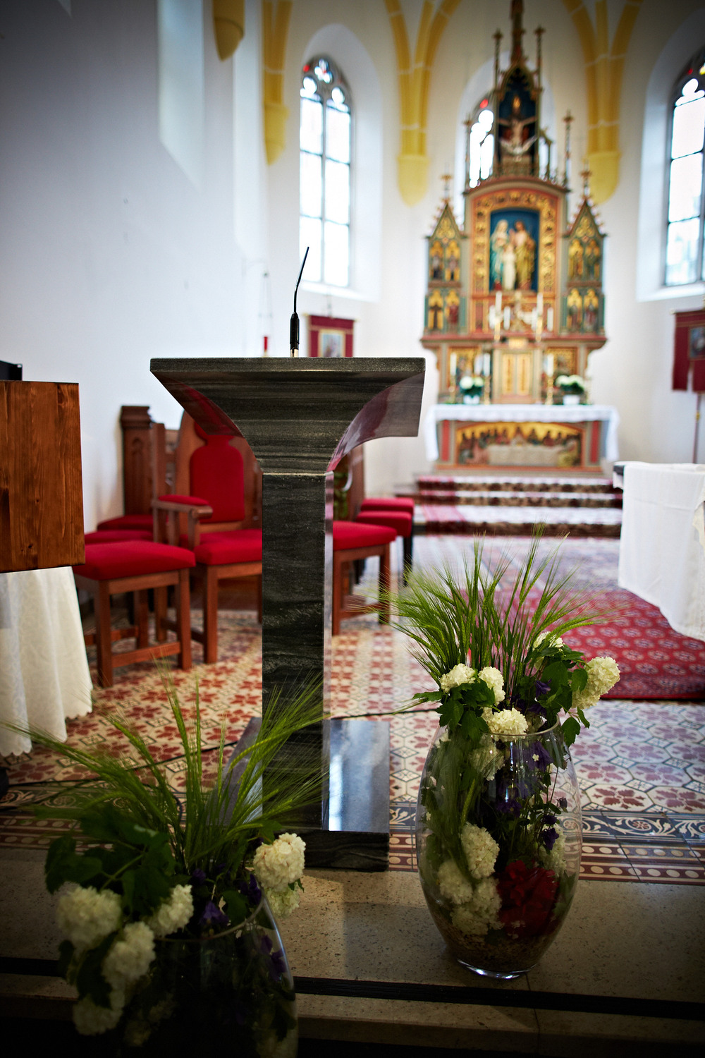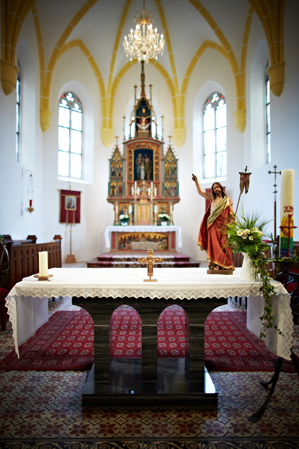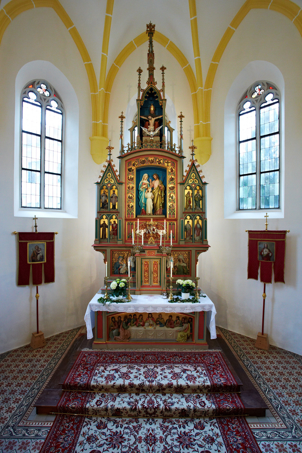 Türen mit Weinlaub und Ähren, darüber IHS-Monogramm, 2 Leuchterengel über den Ecken, seitlich des Tabernakels 2 anbetende Engel (2004 gestohlen!).