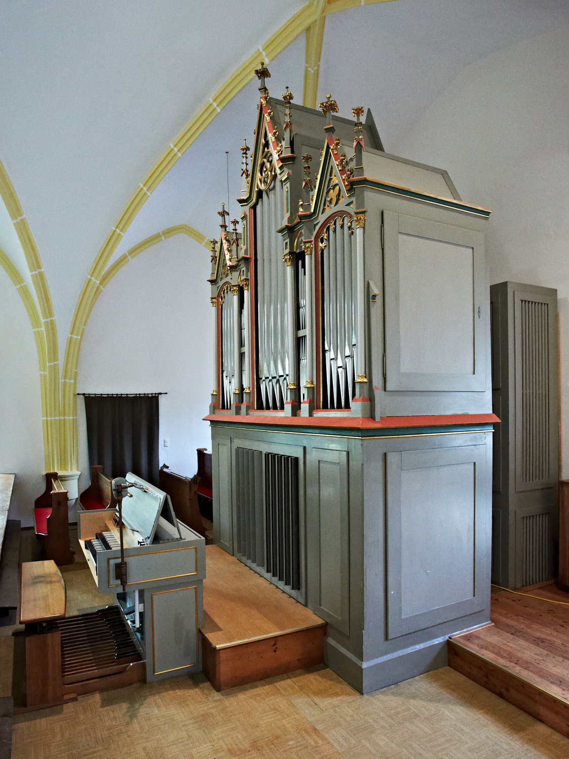 Neugotischer Prospekt, 5-teilig mit 3 übergiebelten, mit Krabben und Fialen besetzten Hauptfeldern, an der rückwärtigen Kirchenwand moderner Pedalkasten, farbig gefasst und vergoldet.