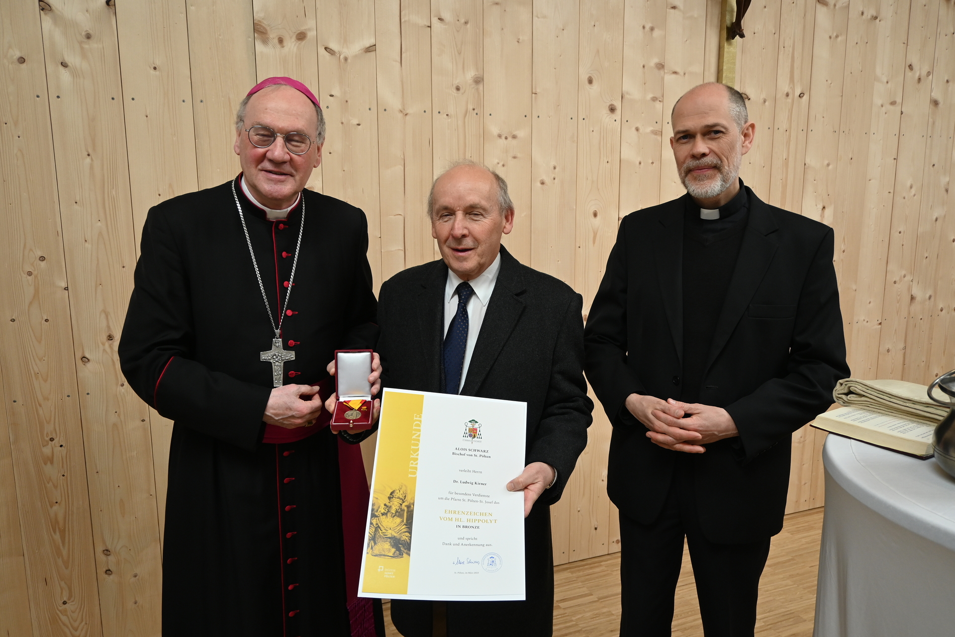 Das Ehrenzeichen vom Hl. Hippolyt in Bronze konnte Bischof Alois Schwarz im Zuge dessen an Dr. Ludwig Kirner überreichen, der sich in den letzten Jahrzehnten im Pfarrkirchenrat besonders um die Pfarre St. Josef verdient gemacht hat.