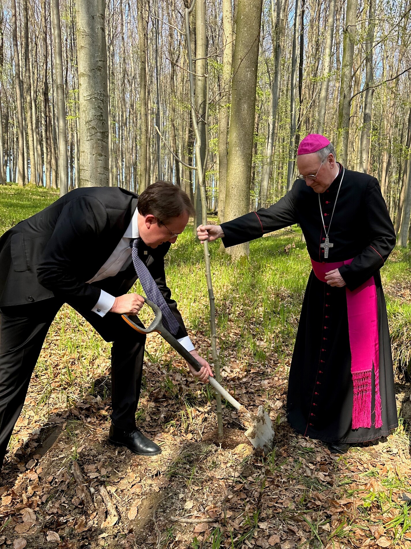 Bischof Alois Schwarz eröffnete und segnete den Klosterwald unweit des Schlosses Ochsenburg im Süden von St. Pölten. Im Rahmen der Zeremonie setzten Bischof Alois Schwarz, Bürgermeister Matthias Stadler und Klosterwald Geschäftsführer Christian Berner ein zusätzliches Zeichen, indem sie vor Ort einen jungen Baum pflanzten. Eingebettet in den stattlichen Bestand, kann dieser nun in Ruhe heranwachsen.