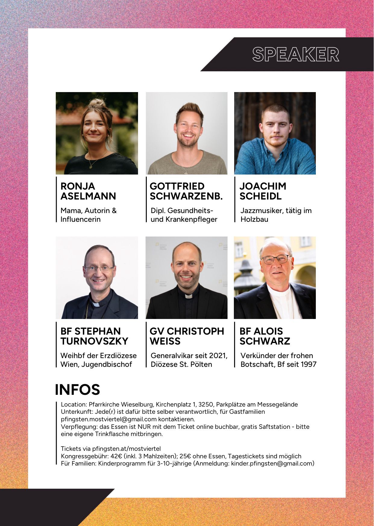 „Pfingsten heißt bei uns: Freude, Gemeinschaft, Lobpreis, Inputs, Party und ganz viel Heiliger Geist“, so Tanja Ziegelwanger von der Loretto Gemeinschaft Mostviertel. Wie im letzten Jahr wird die Veranstaltung von der Diözese St. Pölten unterstützt und so zelebriert Bischof Alois Schwarz den Festgottesdienst am Sonntag. Eine weitangereiste Speakerin kommt aus Hannover: Mama, Autorin und Influencerin Ronja Aselmann wird das Wochenende als erste Speakerin starten. Gottfried Schwarzenberger und Joachim Scheidl, der auch der Schlagzeuger der Pfingstband ist, werden in zwei Inputs über ihr Glaubensleben berichten.