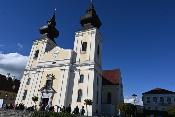 Zahlreiche Pilger aus der Region versammelten sich vormittags bei der Coronakirche in Leiben, um gemeinsam den Weg nach Maria Taferl zurückzulegen. Unter strahlendem Himmel zogen sie betend und singend durch die malerische Landschaft, mit dem Ziel vor Augen: die Wallfahrtsbasilika Maria Taferl.