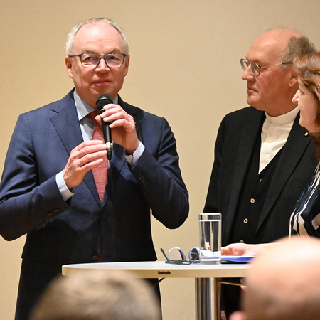 Nach einer Begrüßung und Einstimmung durch Moderatorin Christa Ruspeckhofer (eNu) standen Gespräche mit hochrangigen kirchlichen und politischen Vertreterinnen und Vertretern im Mittelpunkt. Unter anderem sprachen Bischof Schwarz, Superintendent Michael Simmer und Domdekan Dr. Rudolf Prokschi über die Verantwortung der Kirchen für die Umwelt sowie die Entwicklungen zehn Jahre nach der Enzyklika Laudato si.