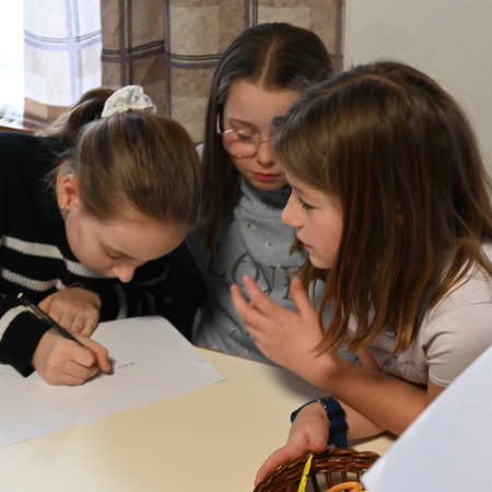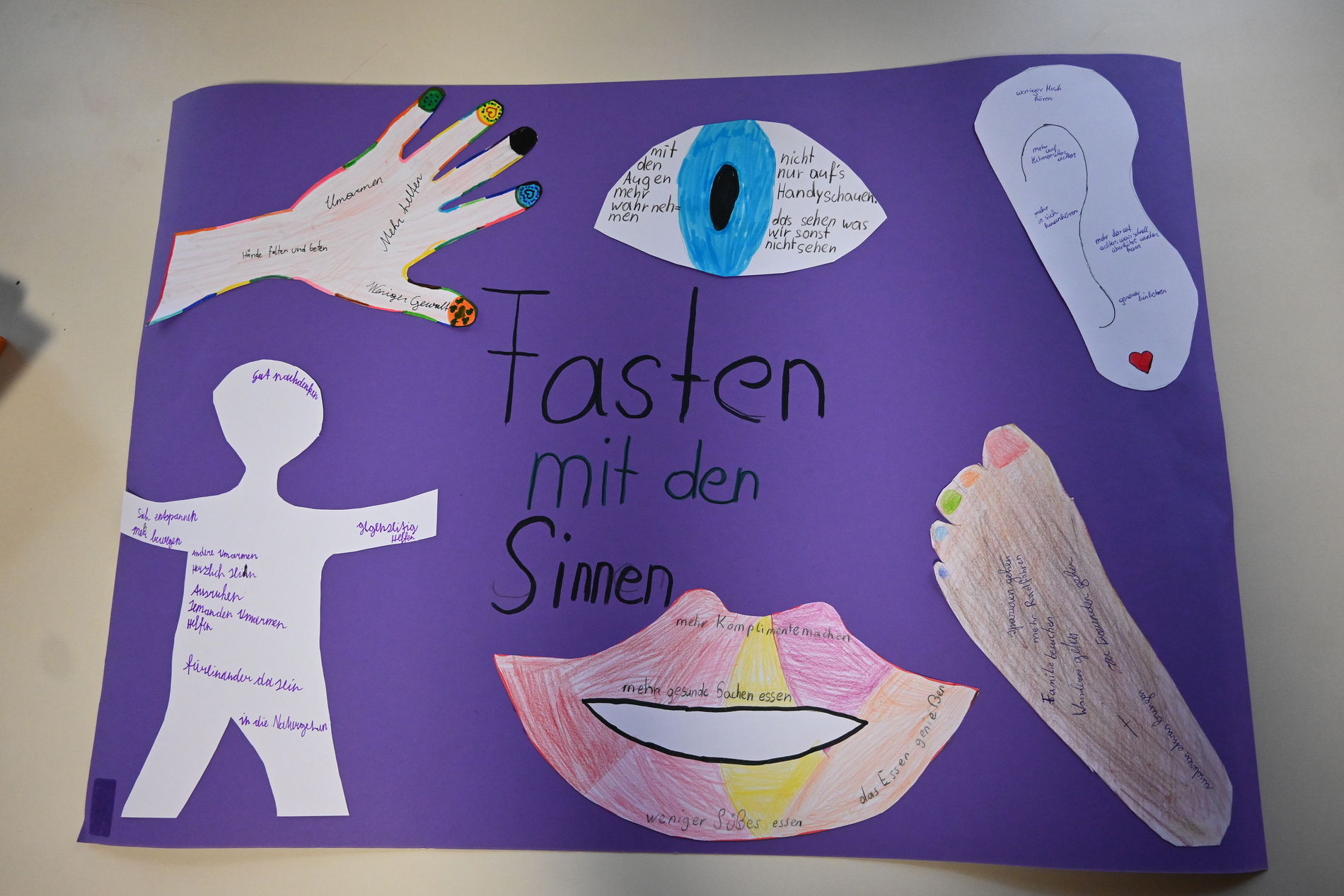 Anschließend tauschten sie sich über das Thema „Fasten mit allen Sinnen“ aus und gestalteten dazu ein Plakat für die Kirche. In der Kirche wurde zudem der Ablauf eines Kreuzweges geprobt.
