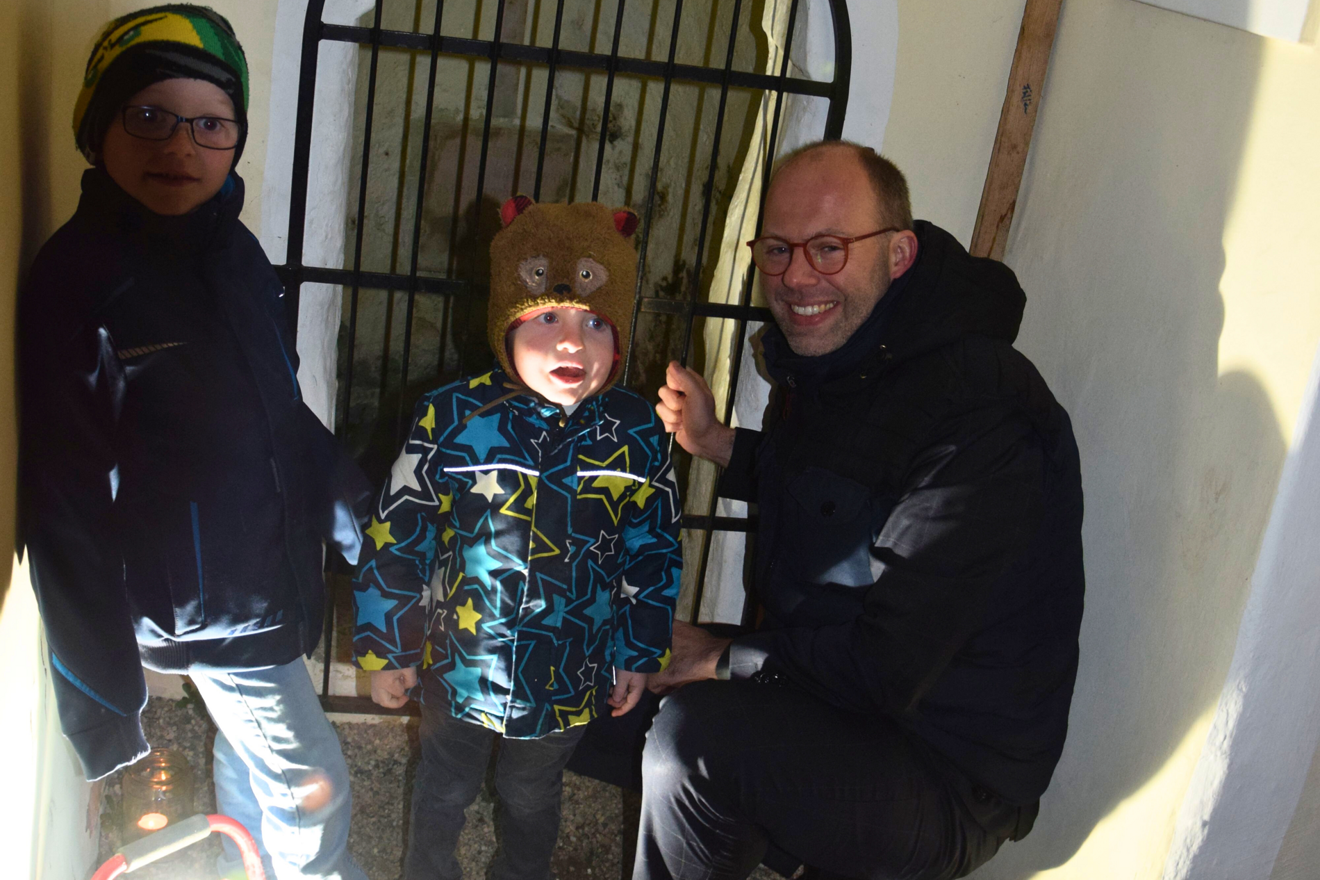 Anschließend führte der Weg zum Heiligen Brunnen, wo die Sage um das heilende Wasser des Brunnens eindrucksvoll vorgetragen wurde. Zurück an der Kirche erfuhren die Anwesenden spannende Details über das geheimnisvolle „Söhnleingrab“, bevor sie bei einer Besichtigung der Sakristei Einblick in die historischen Schätze der Kirche erhielten.