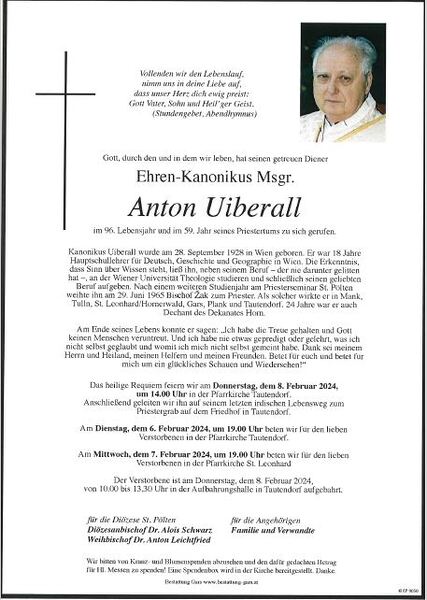 Das Begräbnis von Pfarrer Uiberall findet am Donnerstag, den 8. Februar, um 14:00 Uhr in der Pfarrkirche in Tautendorf statt.